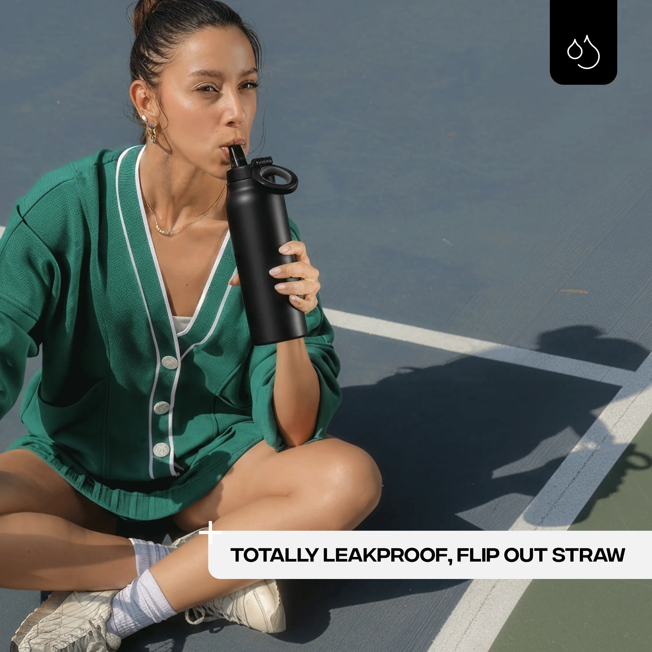 Flip out the integrated leak proof straw to sip on the go.