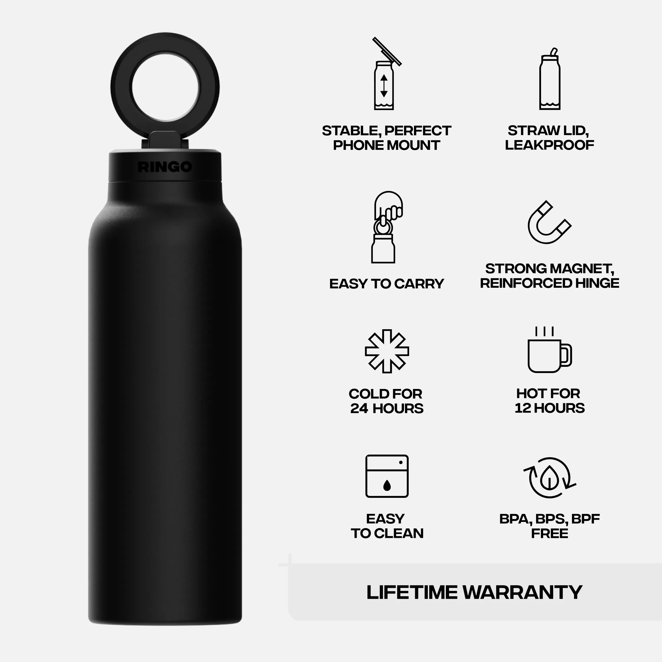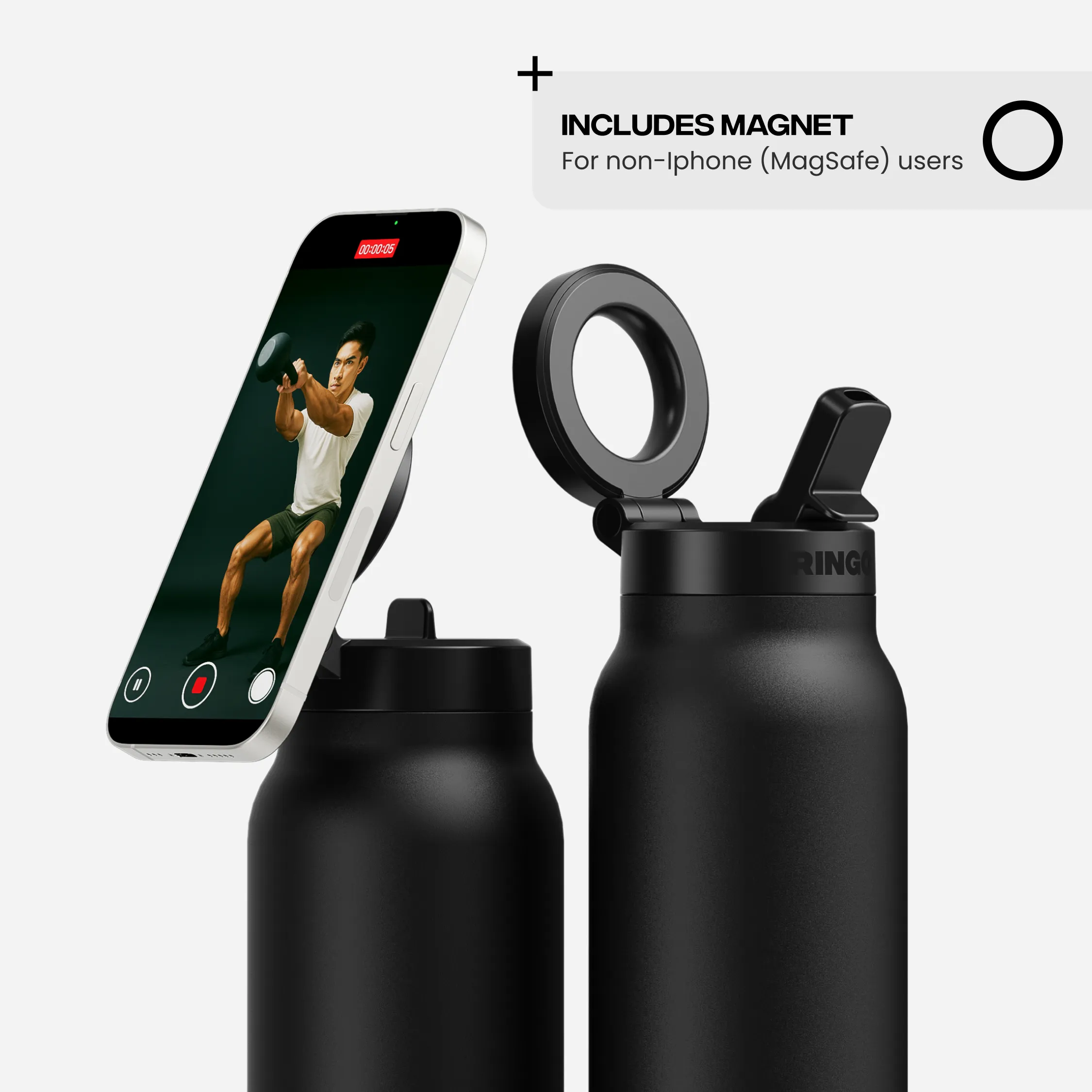 Ringo PRO isn’t just a water bottle—it’s a game-changer. With a built-in MagSafe-compatible mount, it securely holds your phone at the perfect angle for workouts, video calls, or content creation. No more awkward balancing acts—just seamless convenience.